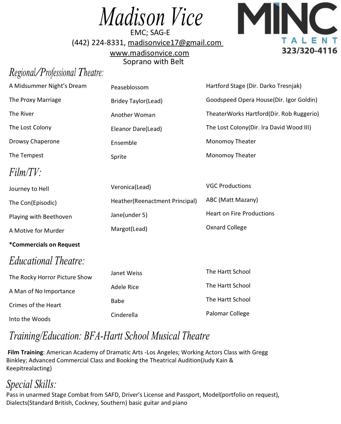 Madison has experience in both film and theatre! She has been lucky enough to work with experienced Broadway directors and prominent film producers.